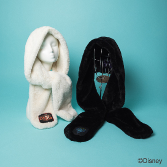 ディズニー・アニメーション映画『101匹わんちゃん』に登場する「クルエラ」と、『眠れる森の美女』に登場する「マレフィセント」をイメージしたマフラー付きフード。