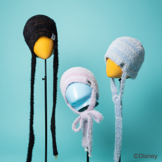 ふんわりとしたフェザーヤーンとミックス糸が、トレンド感たっぷり。キャラクターたちをモチーフにした、遊び心あるあご紐とサイドの織りネームがアクセントになっています。
