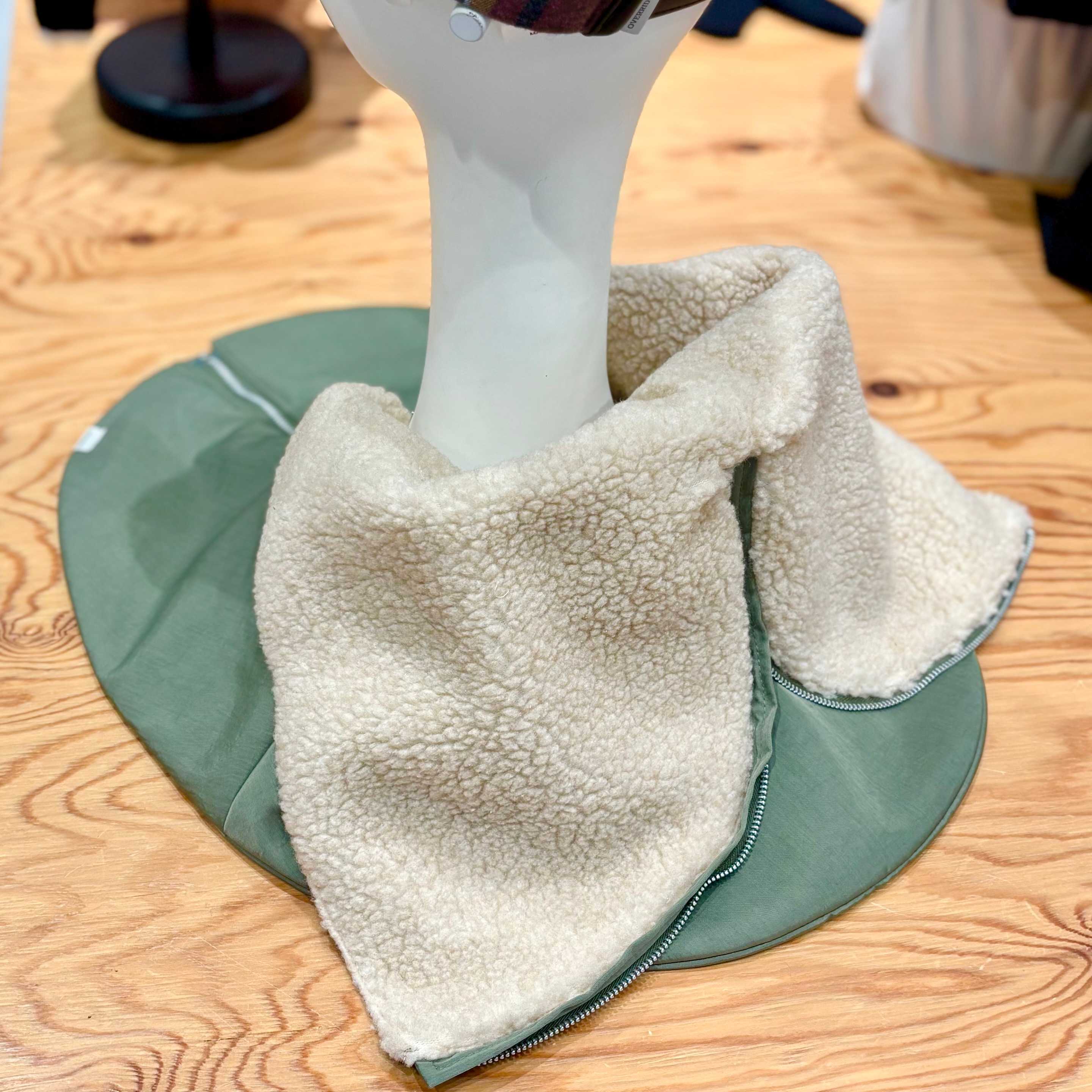 フード部分のファスナーを開くと大きな襟に変わり、フードと襟の2WAY仕様になっています。オーバーサイズのスウェットやジャケットの中に重ねて着用するのがおすすめ。防寒しながらさまざまなコーディネートが楽しめるアイテムで、洗濯機洗いも可能なので清潔にお使いいただけます。