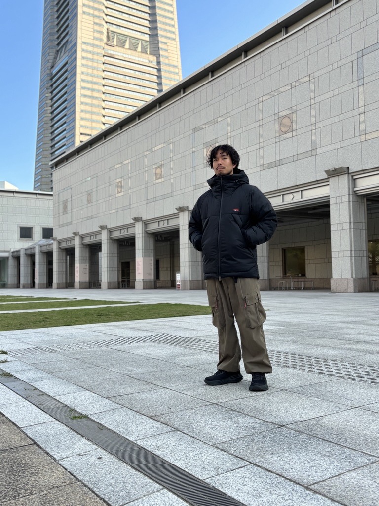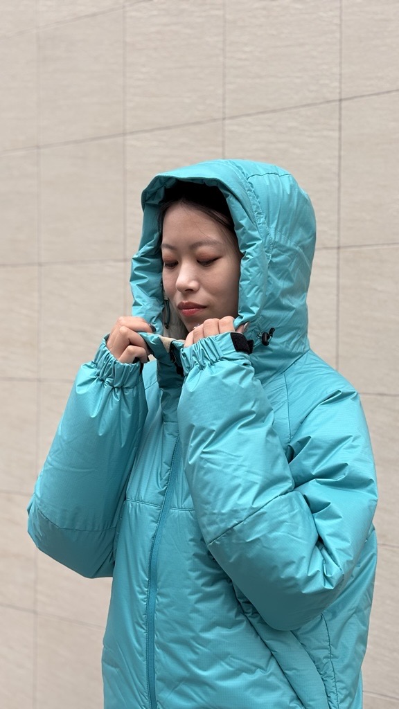 デザイン面では、大き目のハンドウォーマーポケットが目を惹き、手を入れたままでもシルエットが崩れにくい設計に。少しゆとりのあるシルエットは厚手のインナーとも相性が良く、タウンユースでもストレスなく着用できます。フロントには止水ファスナーを採用し、冷たい風や雨の侵入をしっかりと防ぎます。また、フードデザインが特徴的で、冷気や風の侵入を防ぐためにやや高めに設計されています。特に風が強い環境や寒冷地での使用時に首元をしっかりと保護し、体温を維持する効果が高まります。