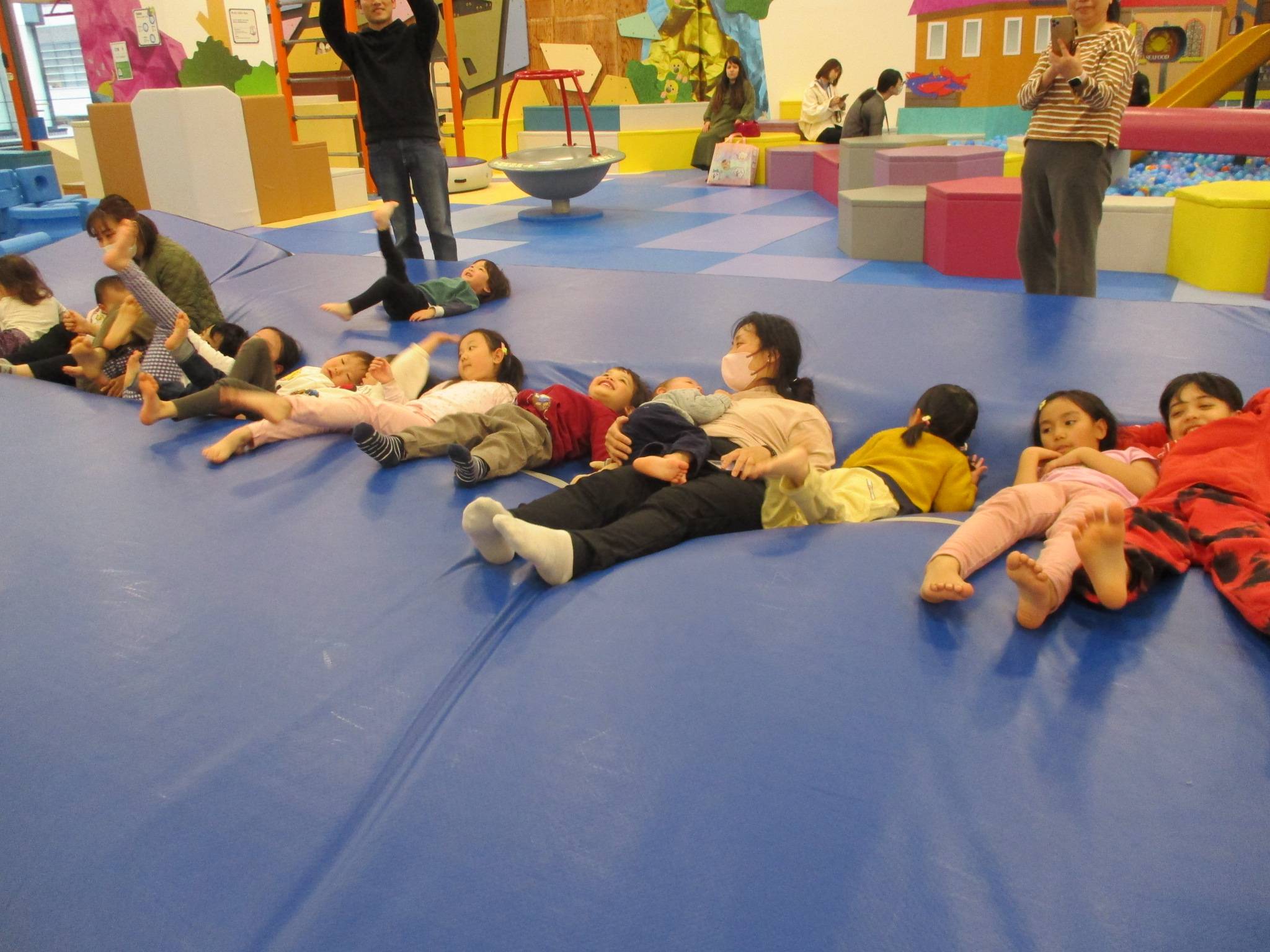 空気で膨らんでいるトランポリンの空気を抜いてふわふわした感覚を楽しむことができる、ふわふわベッドというイベントをサプライズでおこなっています。ふしぎな感覚をお楽しみください。