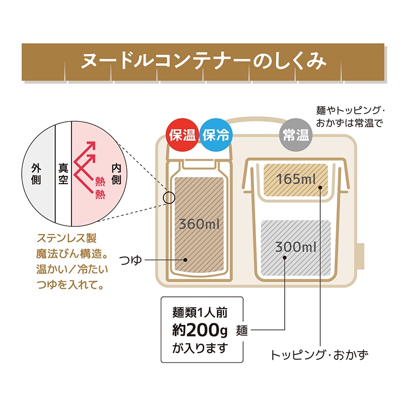 保温・保冷のスープジャーと汁漏れしにくい容器がセットになった麺対応のお弁当箱です!