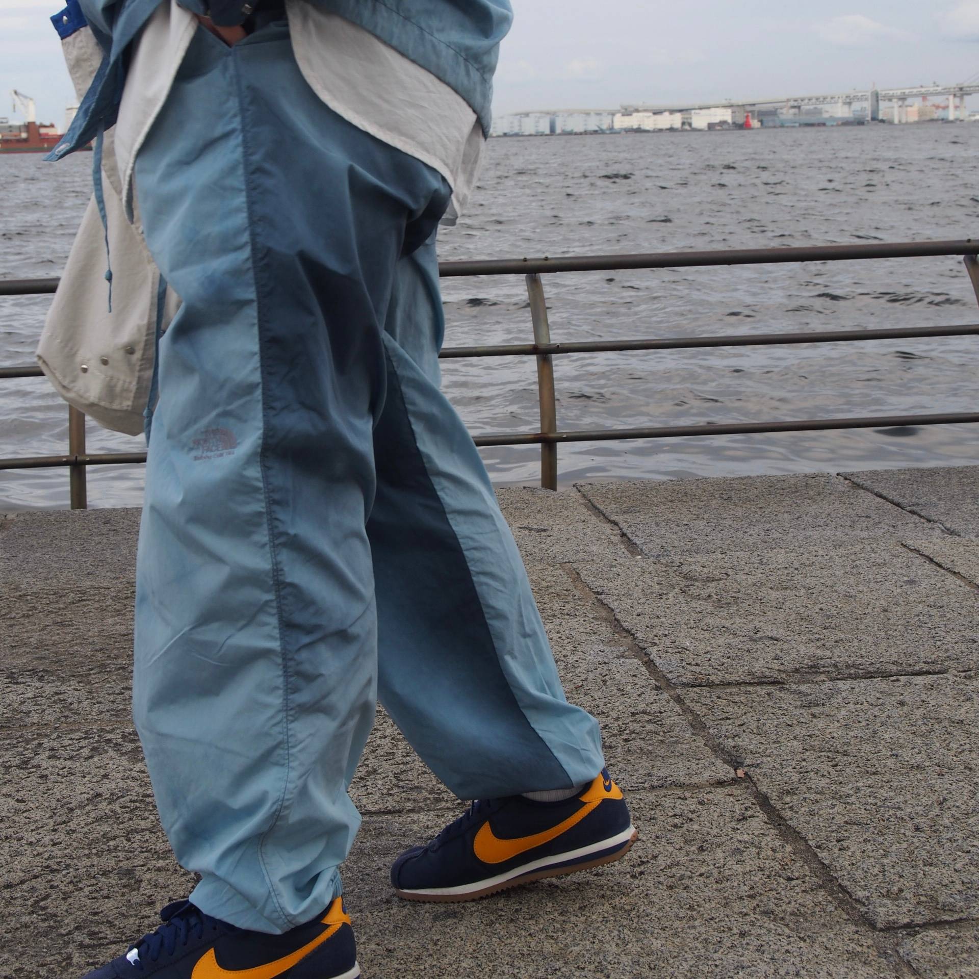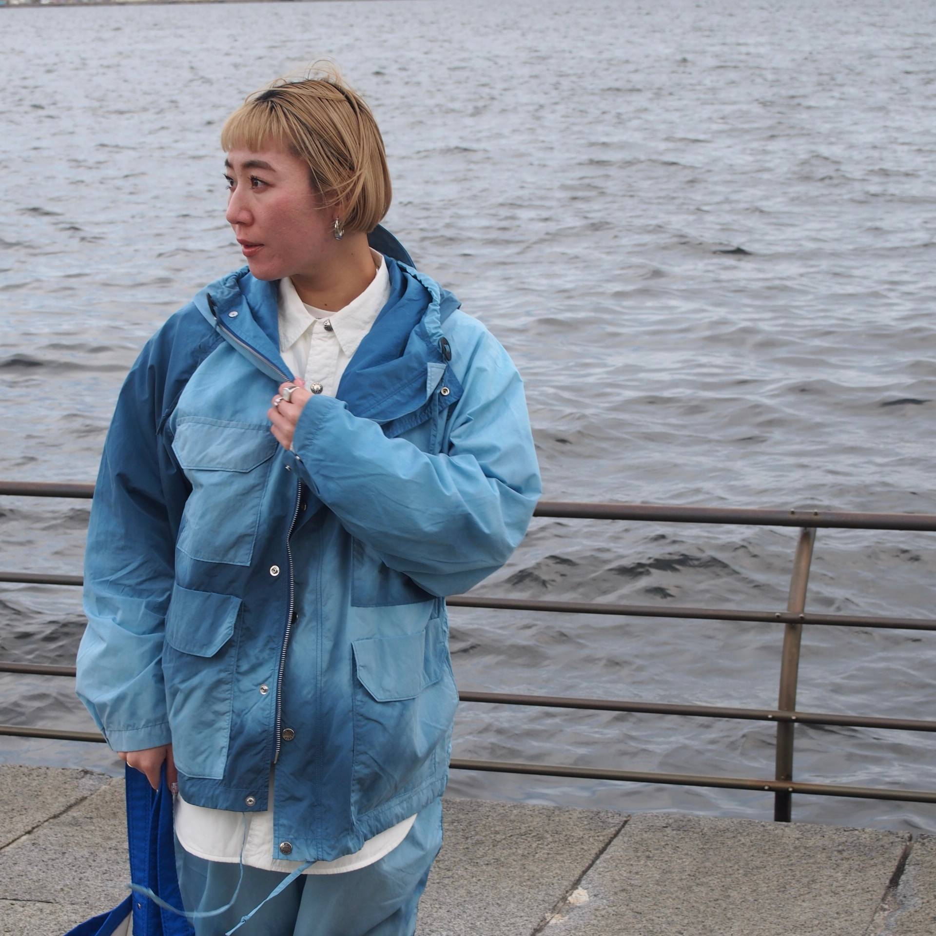 リサイクルナイロンタフタを使用したマウンテンパーカ、パンツです。特殊技法で生地をムラ染め加工を施し、ニュアンスのある表情を表現しました。