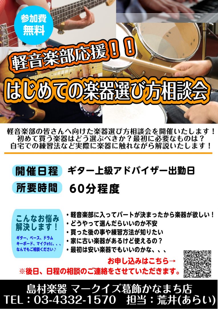 2026.03.30 【軽音楽部応援!!】はじめての楽器選び相談会を開催します! この度島村楽器マークイズ葛飾かなまち店では、軽音楽部に入部する新入生向けに楽器選び相談会を開催いたします!ギター、ベース、ドラム、キーボード、ボーカルのマイクまでなんでもご相談くださいませ! 詳細はコチラ 戻る 島村楽器 3F ショップ ショップ情報を見る