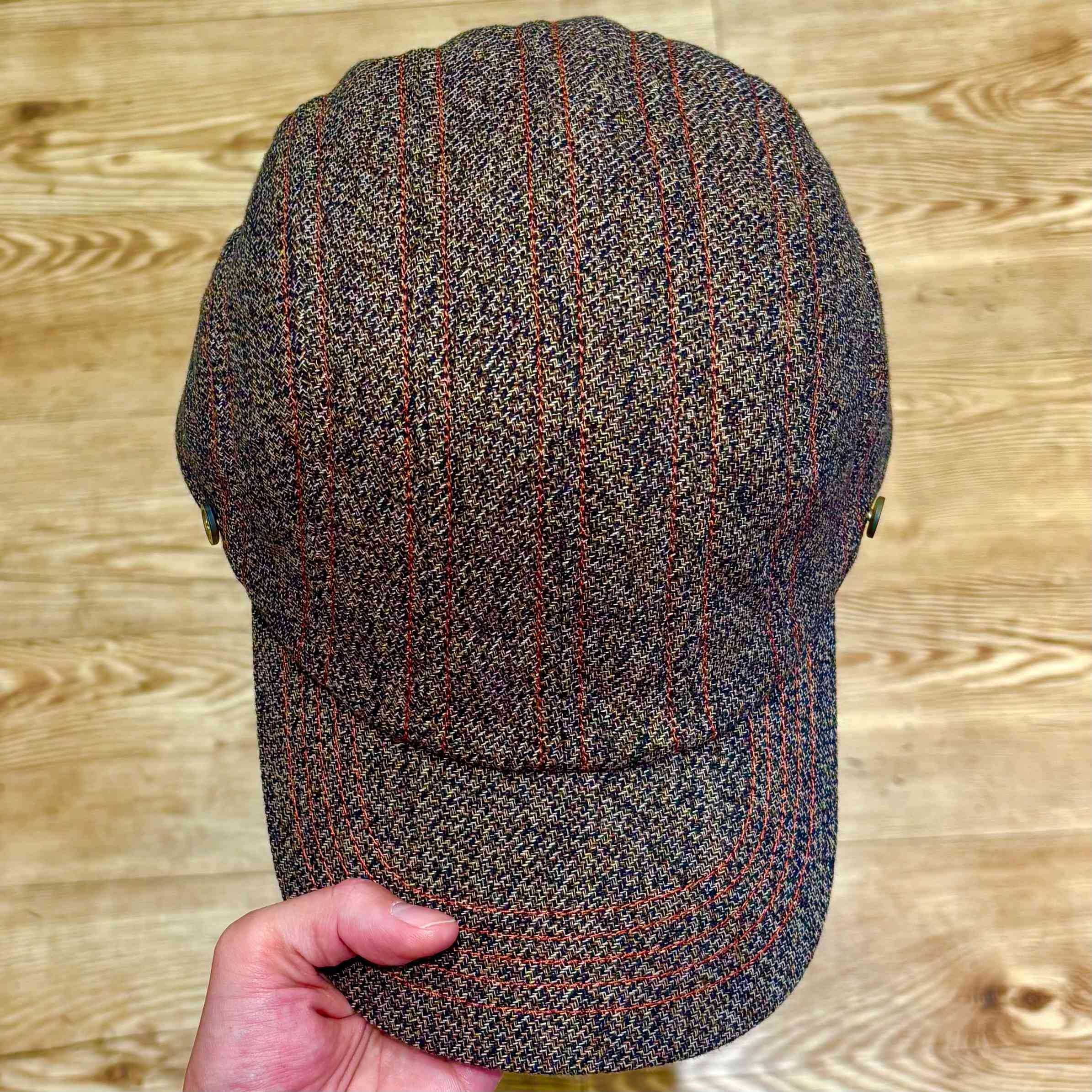 クラウンは一般的な縦方向6枚パネルではなく、前後方向に8枚構成された特徴的なパターンで、トップステッチを配色で打ち、さりげなくアクセントに。たれ部分はボタンでスカーフの着脱が可能。取り外せばボタンがポイントのシンプルなキャップとしても楽しめます。スカーフを結んだり垂らしたりとアレンジの幅も広く、秋冬のスタイリングに遊び心をプラス。ウール見えながらご家庭で洗濯できるのもうれしいポイントです。