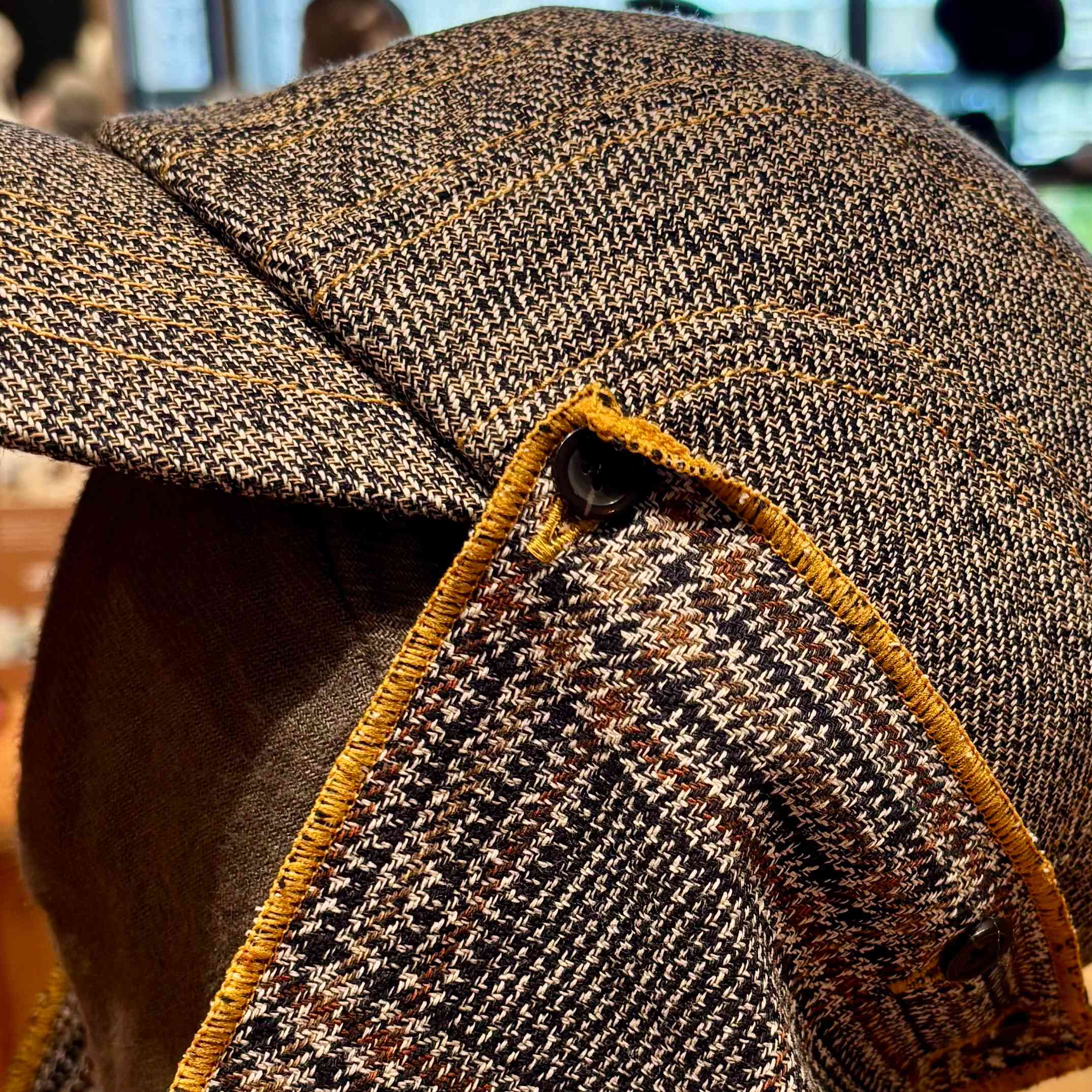 異なる色を三子撚りにした糸を織り上げたメランジ生地を使用した、垂れスカーフ付きのキャップ。コットン100%でありながらウールツイードのような見た目を持ち、秋冬シーズンを通して着用しやすいアイテムです。
