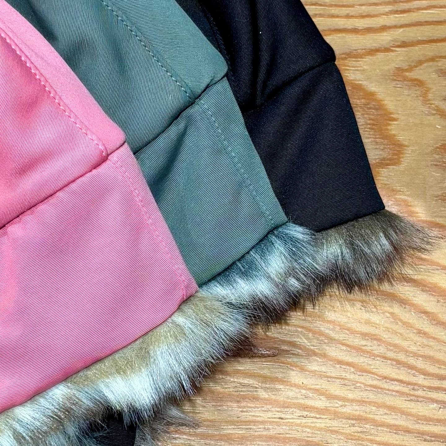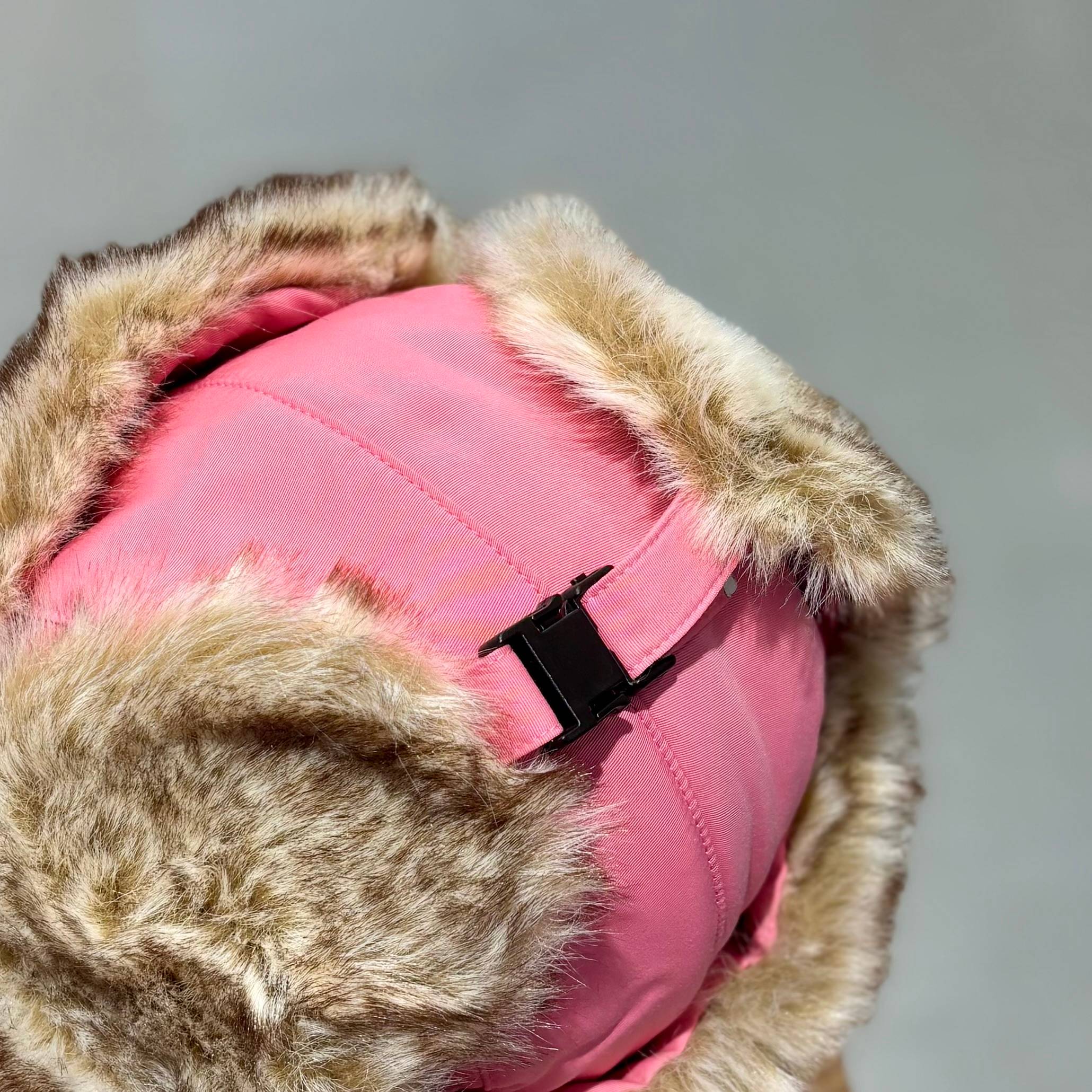 リサイクルポリエステル混素材とフェイクファーを使用したフライトキャップ。表地には環境に配慮したリサイクルポリエステル混素材を使用し、ソフトで軽量ながら撥水加工を施しているため、雪や小雨の日でも安心して着用いただけます。