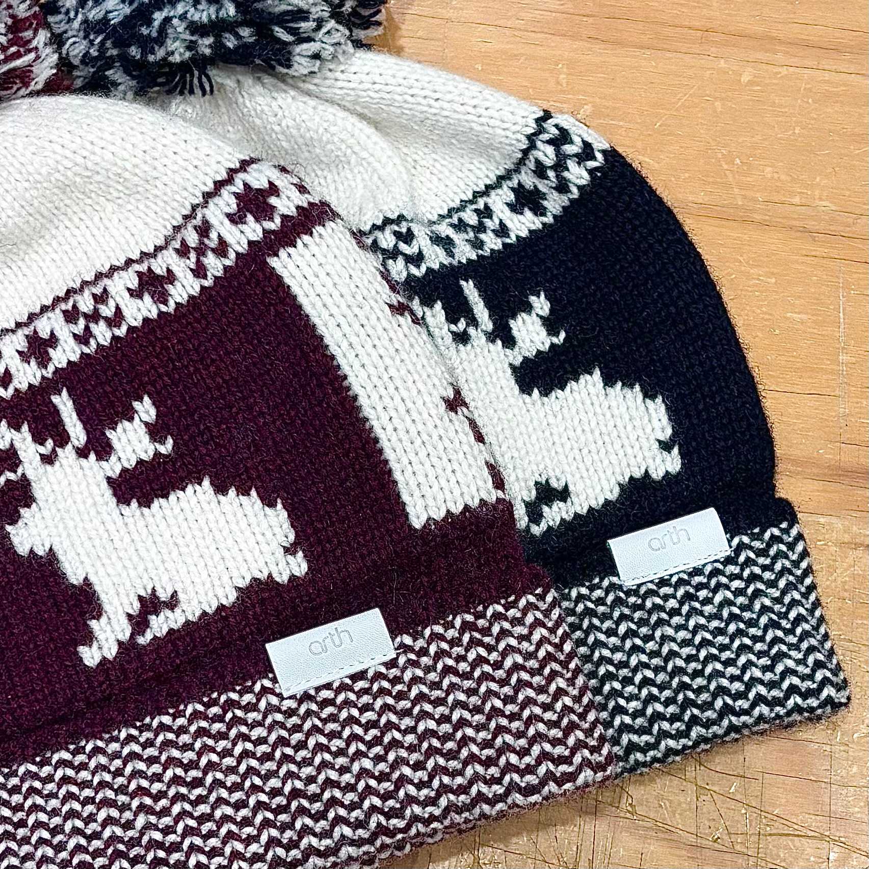 arthのアイコン「ジャッカロープ」と雪の結晶をモチーフにしたジャカード柄が目を引くニットワッチ。ノスタルジックなポンポン付きデザインで、カレッジ風コーデやストリートスタイルの“はずし”にもぴったりです。