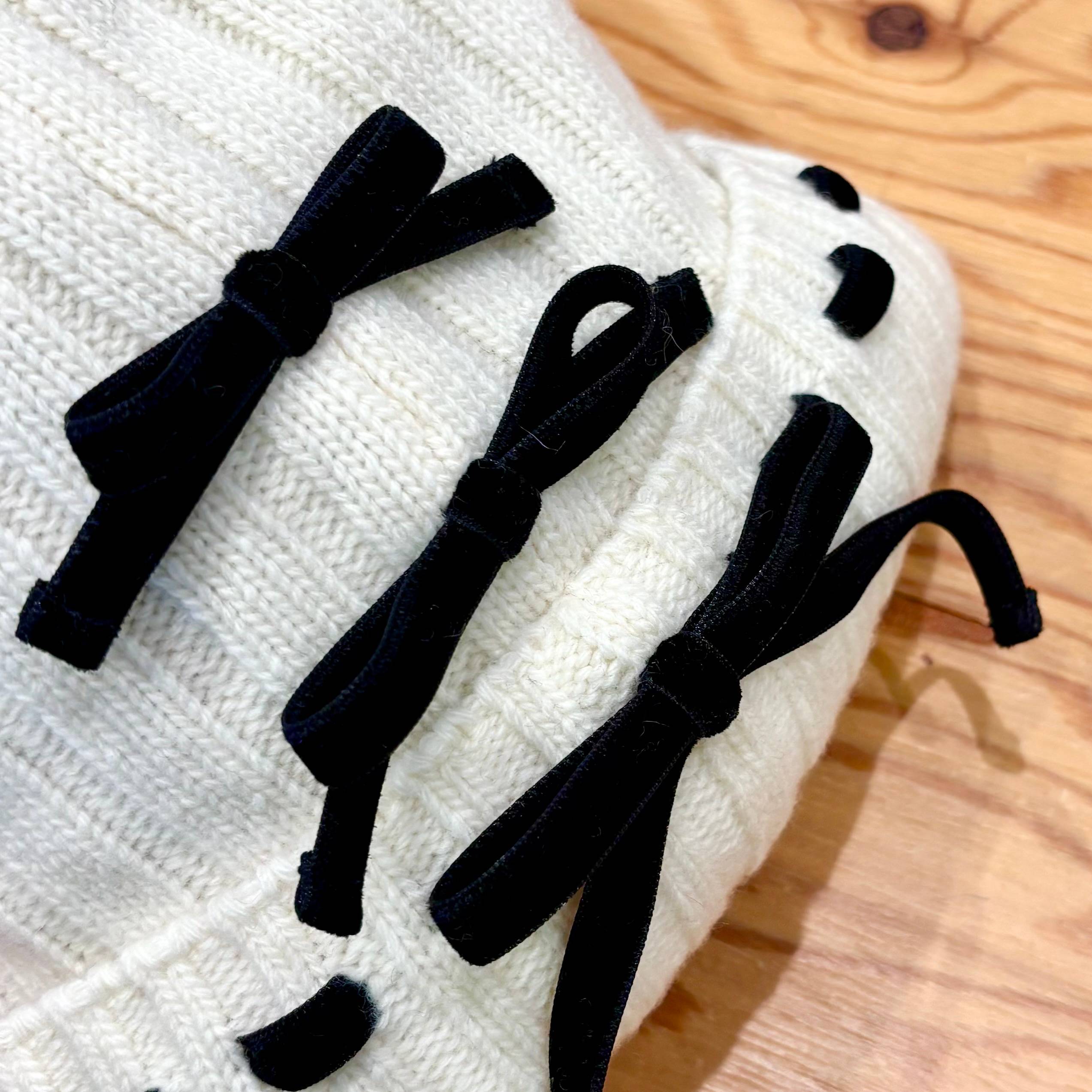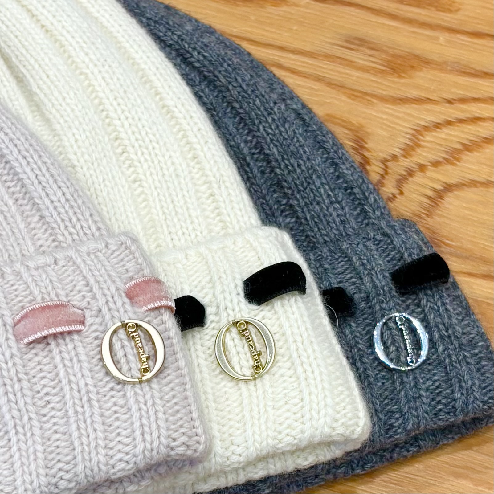 ホワイトカシミヤとエクストラファインメリノウールをブレンドした糸を使用した、上質なニットワッチ。柔らかく、かぶり心地の良い素材感です。シンプルなシルエットに、細幅のベルベットテープをトリミングし、バックサイドにはリボンを3つ配置。後ろ姿も素敵に演出します。