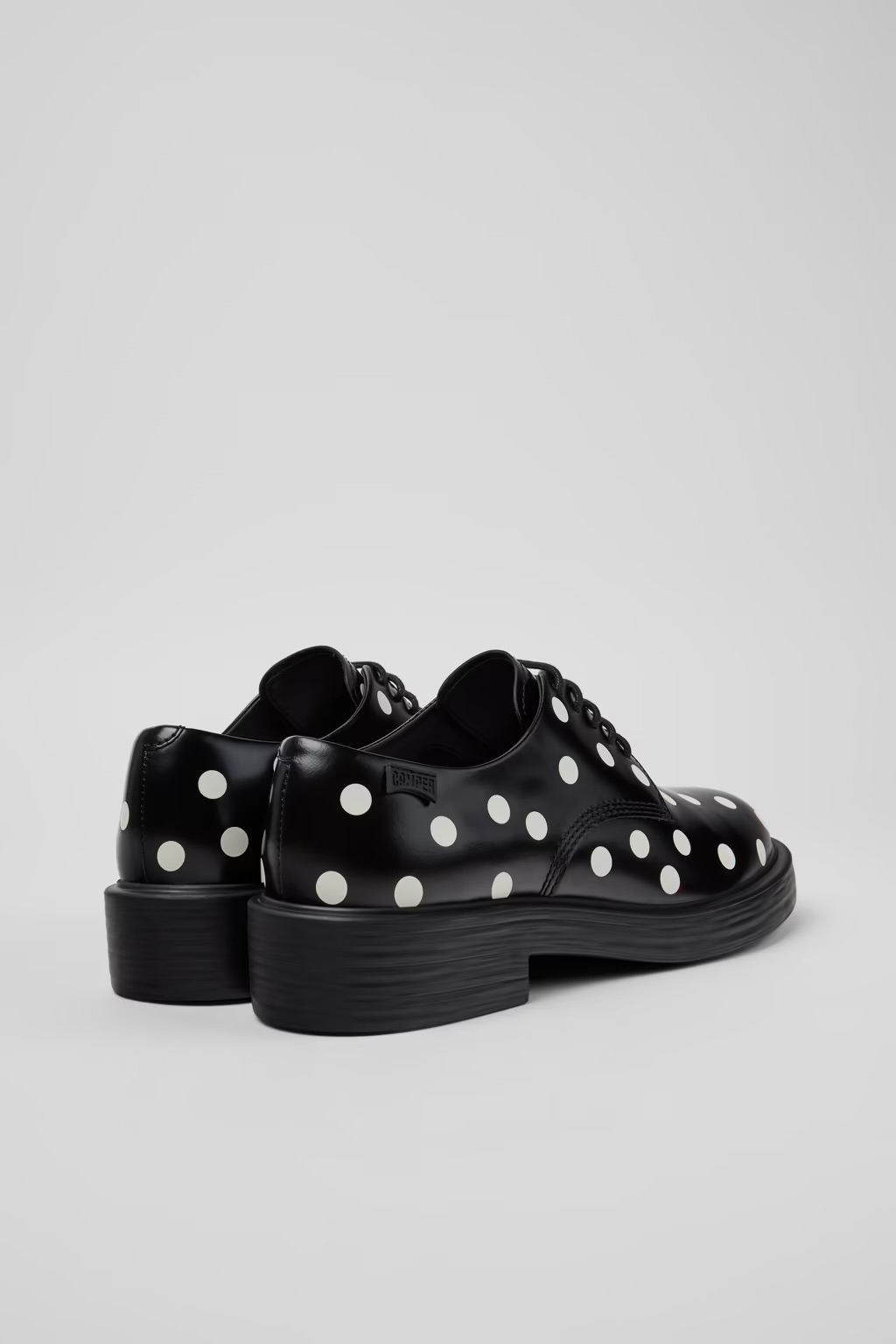 ブラック×ホワイトの大胆なコントラストに、ポルカドットやラッフル、フリンジなどの伝統的ディテールを取り入れています。