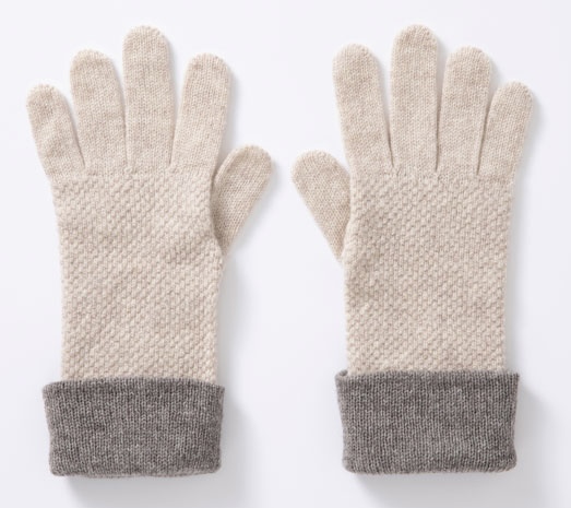 やわらかなウール糸を、鹿の子編みで表情豊かに編み上げました。手首まであたたかく包み込む長めの丈で、手首部分を折り曲げても、伸ばしてもお使いいただけます。手首まわりは色を変えてアクセントをつけました。お家で洗濯できるのもうれしい特徴です。