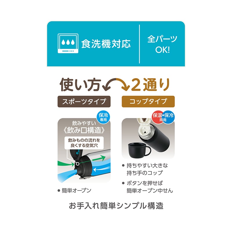 飲み口を変えてスポーツタイプとコップタイプの2通りの使い方ができる2ウェイボトル♪