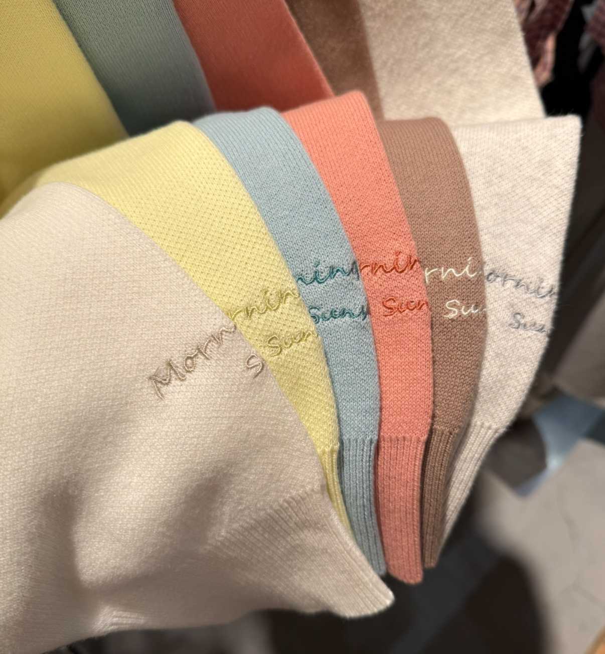 ハイゲージ編みでカジュアルにもきれいめにも対応。袖口の筆記体刺繍が上品なアクセントに。
