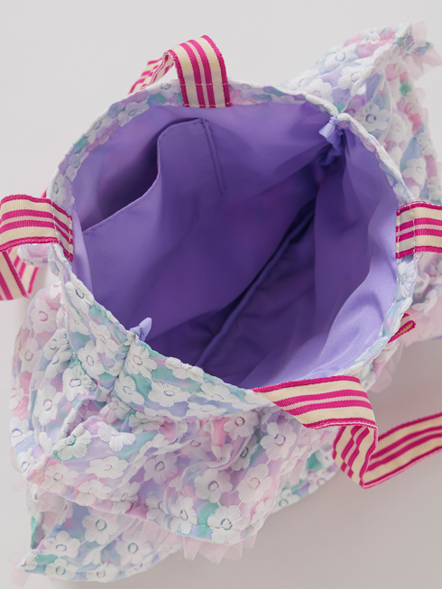 フリルスカートがそのままバッグになったような☆花柄生地に繊細なレースを重ねたリボン付きトートバッグが登場♪