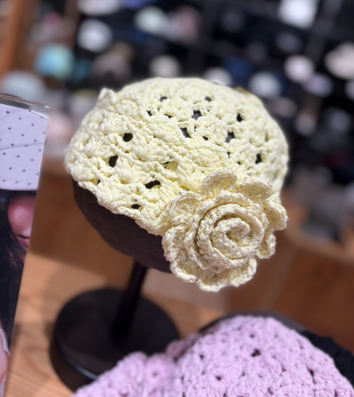 お花部分にはスパンコール入りラメ糸をミックスしており、光を受けてほんのりと輝くアクセントに。