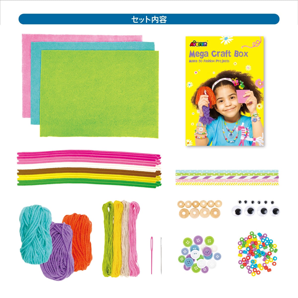 ボタン、紙ストロー、刺繍糸、毛糸玉など、