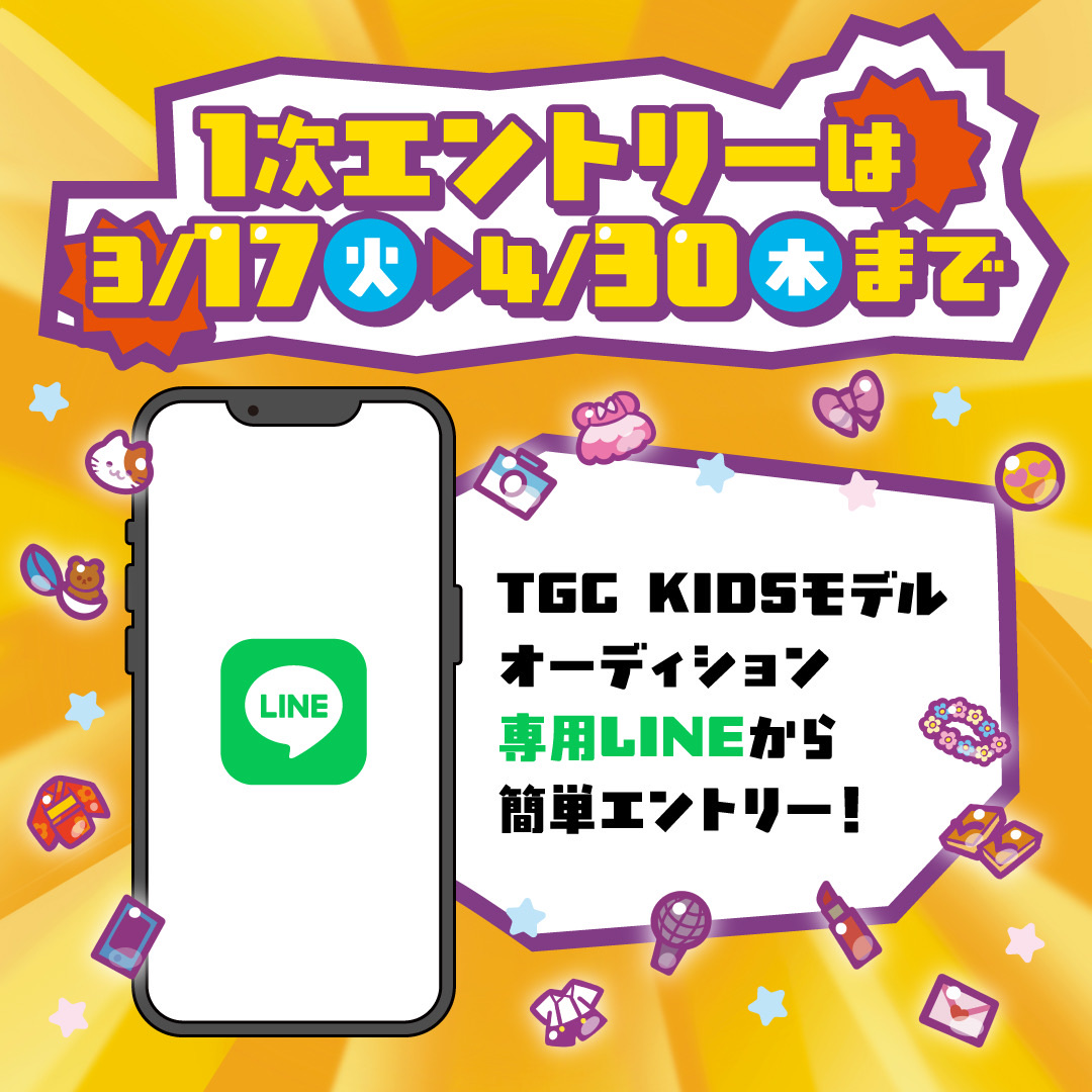 1次エントリーは3月17日(火)~4月30日(木)の期間に、TGC KIDSオーディション専用LINE(@229snikb)からエントリーするだけ
