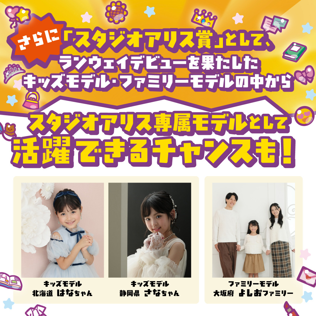 スタジオアリス賞として、ランウェイデビューを果たしたキッズモデル・ファミリーモデルの中からスタジオアリス専属モデルとして活躍できるチャンスも!?