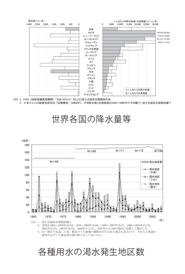 私たちが暮らす日本は、湿潤なモンスーンアジアの東端に位置しています。世界(陸域)の年平均降水量が約810ミリメートルなのに対し、日本の年平均降水量は、およそ2倍の1690ミリメートル。これだけ聞くと、「水環境に恵まれた国」という印象ですが、この降水量に国土面積をかけて全人口で割り、人口1人あたりの年平均降水量を算出すると、日本の場合1人あたり約5000立方メートルとなり、世界平均1人あたり約16400立方メートルの、わずか3分の1程度ということになります。